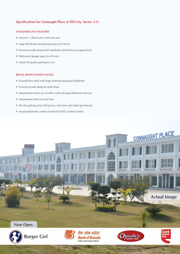 TDI Connaught place has been conceptualized to offer the most exclusive office and retail spaces, that provide a sophisticated location for retailers to present their brands to the consumers in the region. Ideally located, with connectivity to all sectors of greater Mohali, these showroom units have been designed keeping in mind the contemporary and Colonial architecture combined with modern ambience of fascinating elegance, with large storefront facades that are developed along covered promenades. The office spaces and retail stores are complete with usability features such as spacious parking, glazed doors, terraces and aesthetically designed green spaces. The layouts focus on the highest quality of architecture and construction, coupled with world class safety and security features.